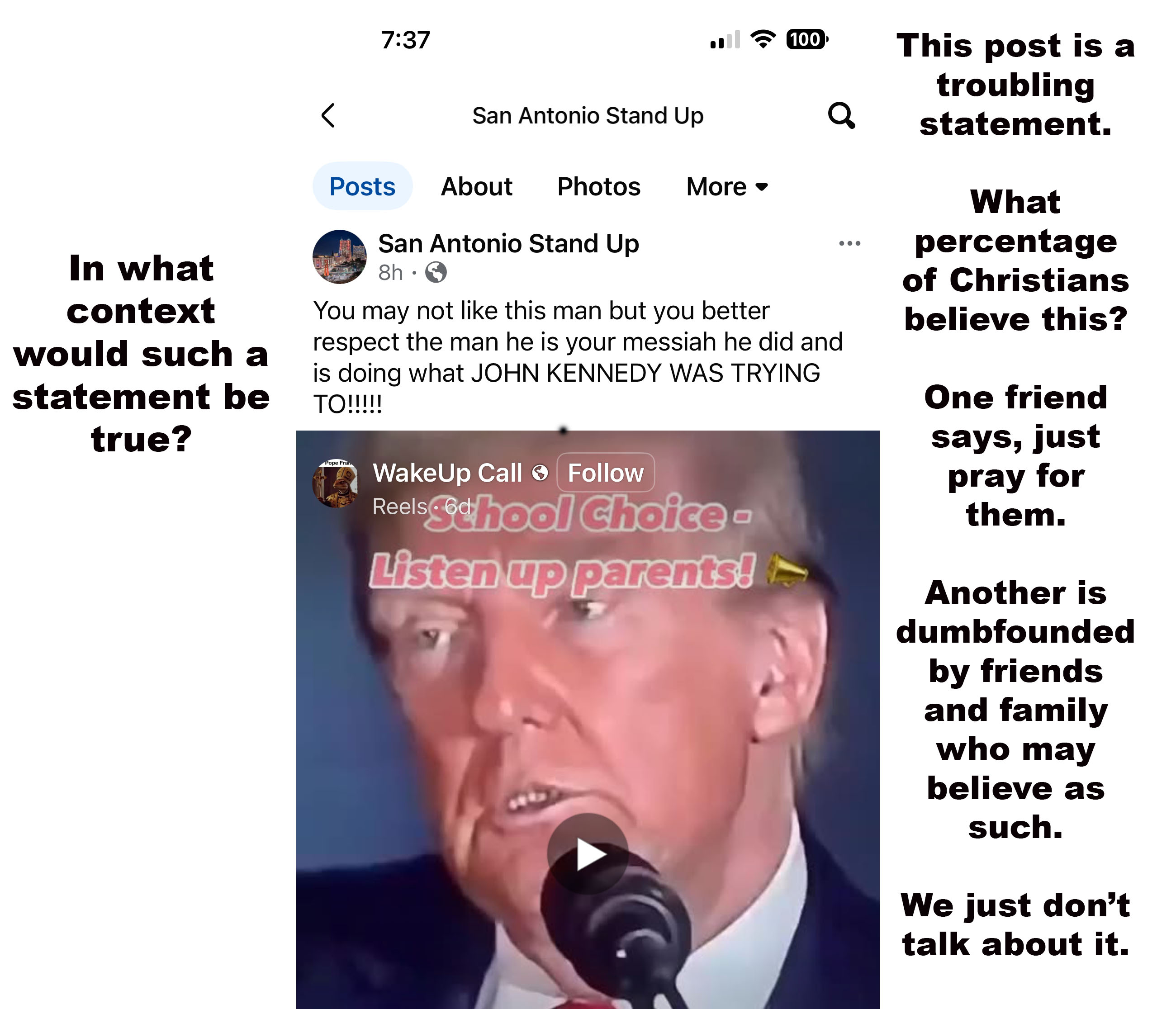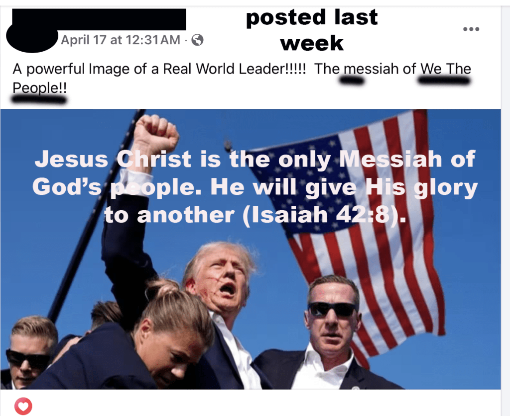 What we believe about God and His Son, defines who we are, as a people – NOT as Americans but as the people of God. Making America great (again) is not going to make Christianity great again, or anyone a better Christian, or a better human being. Making this country great, however great is to be defined, it will not rid the world of evil. It will not bring God any glory. Many things are done in the name of God. And the majority God does not recognize. The Scriptures say that all man’s righteousness is as filthy rags. The image below was posted on Facebook page. The person or person’s responsible for the page read like a conundrum of confusion. What true believer would be believe a mortal man to be the Messiah? Note: Messiah is lowercase and We The People is capitalized.